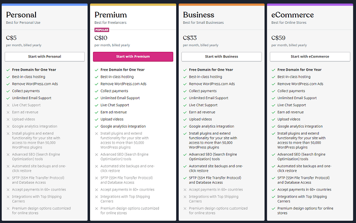 WordPress.com offers a variety of pricing models. To run a fully-functional affiliate site you will likely need to purchase at least the Business package.